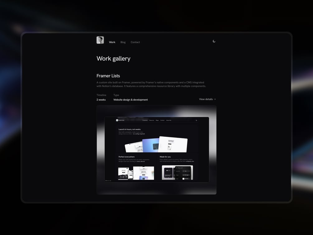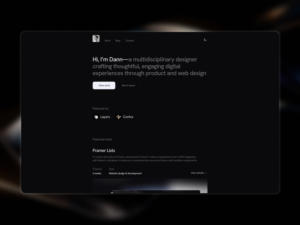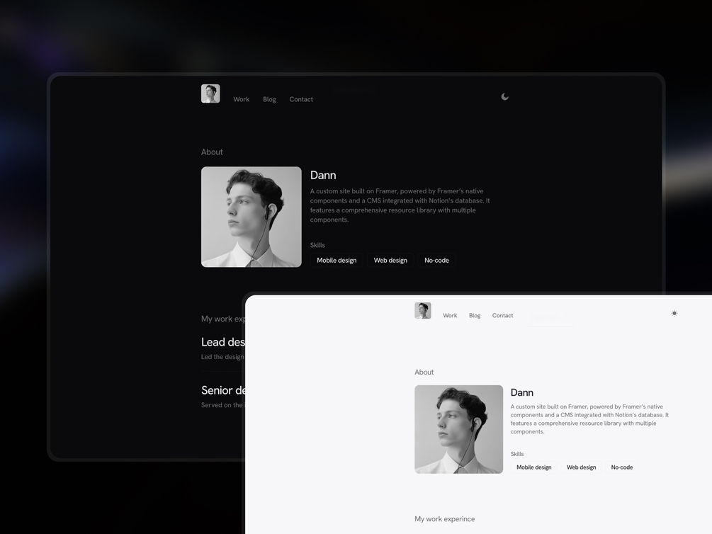 Ethereal is a modern portfolio template for creatives, featuring both light and dark modes. It's easy to customize and maintains a sleek design powered by Framer CMS.
